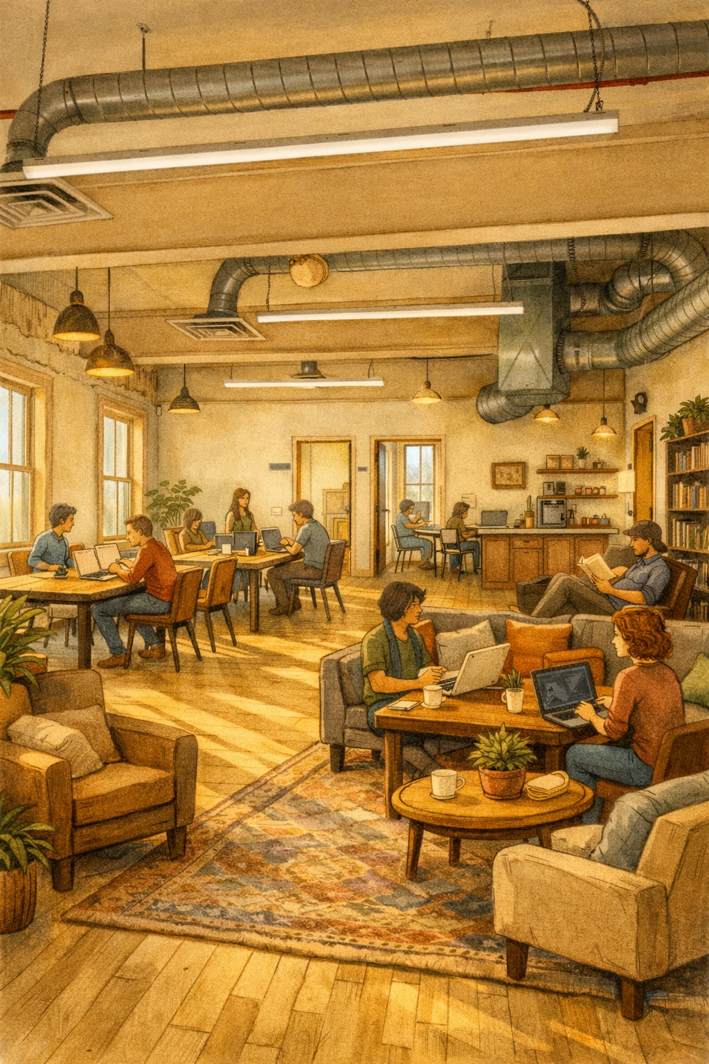 Thoughtfully curated mix of private offices and open co-working spaces designed to support how people actually work, create, and connect. Executive Offices Open Desk + Lounge